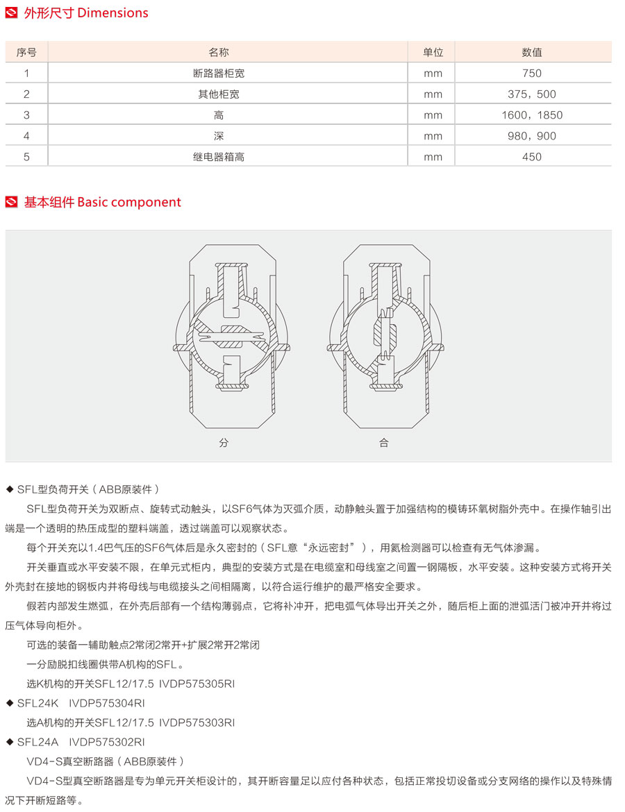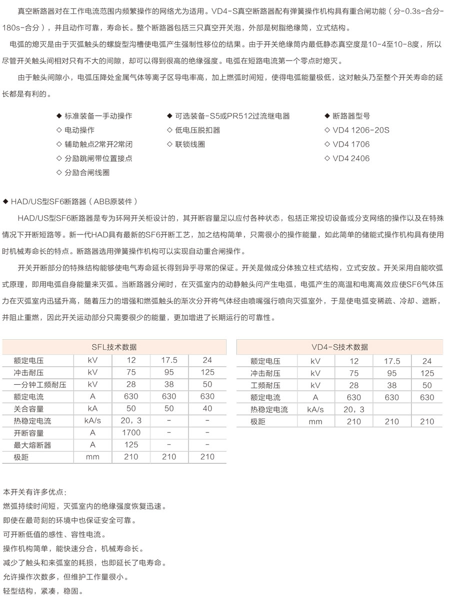 環(huán)網(wǎng)柜的主開關(guān)、操作機構(gòu)及元器件采用ABB公司原裝件或采用進口部件國內(nèi)組裝生產(chǎn)的SFL-12/24型開關(guān)設(shè)備,也可根據(jù)用戶需要配裝ABB公司原裝HAD/US型SF6。斷路器或VD4-S型真空斷路器。其操作方式分為手動、電動兩種。